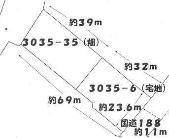 国道188号線沿い。一部畑部分については、農地転用許可要。開発許可要。3035-6(宅地)722.60㎡ 218.58坪 3035-35(畑)794㎡ 240.18坪